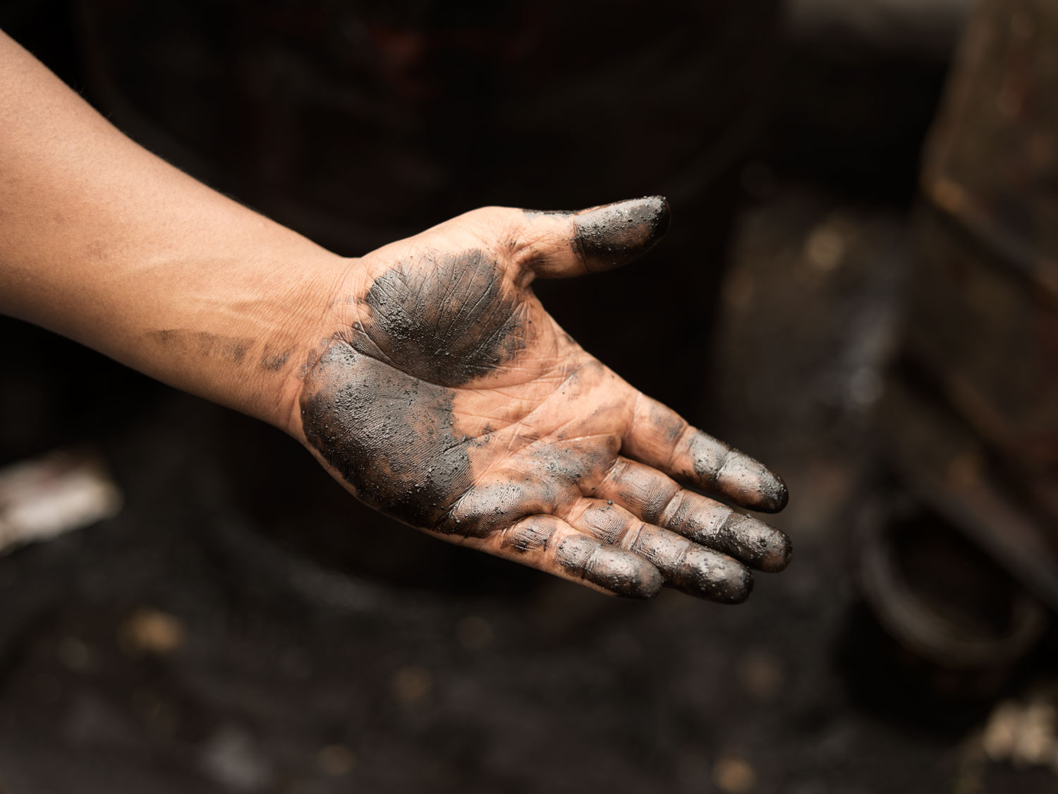 Dłoń pokryta olejem, stocznia Char Mirebagh, Dhaka (2017)