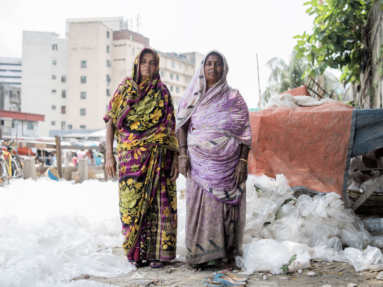 _____ & ______ recykling worków polietylenu po godzinach na targu rybnym Karwan Bazar, Tejgaon, Dhaka, (2017)