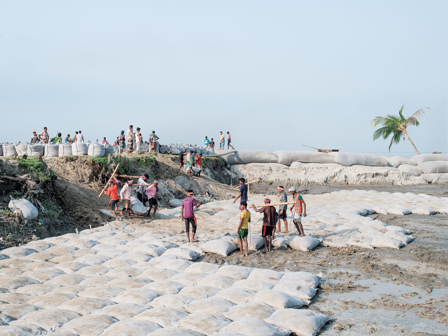 Do budowania systemu obrony brzegów rzek zatrudniani są migranci z północy Bangladeszu, gdzie regularnie wykonuje się ciężkie prace rolnicze. Przenoszenie worków z piaskiem i betonowych bloków o wadze do 300 kg wymaga pracy w czteroosobowych zespołach wykorzystując bambusowe tyczki do rozłożenia ciężaru.