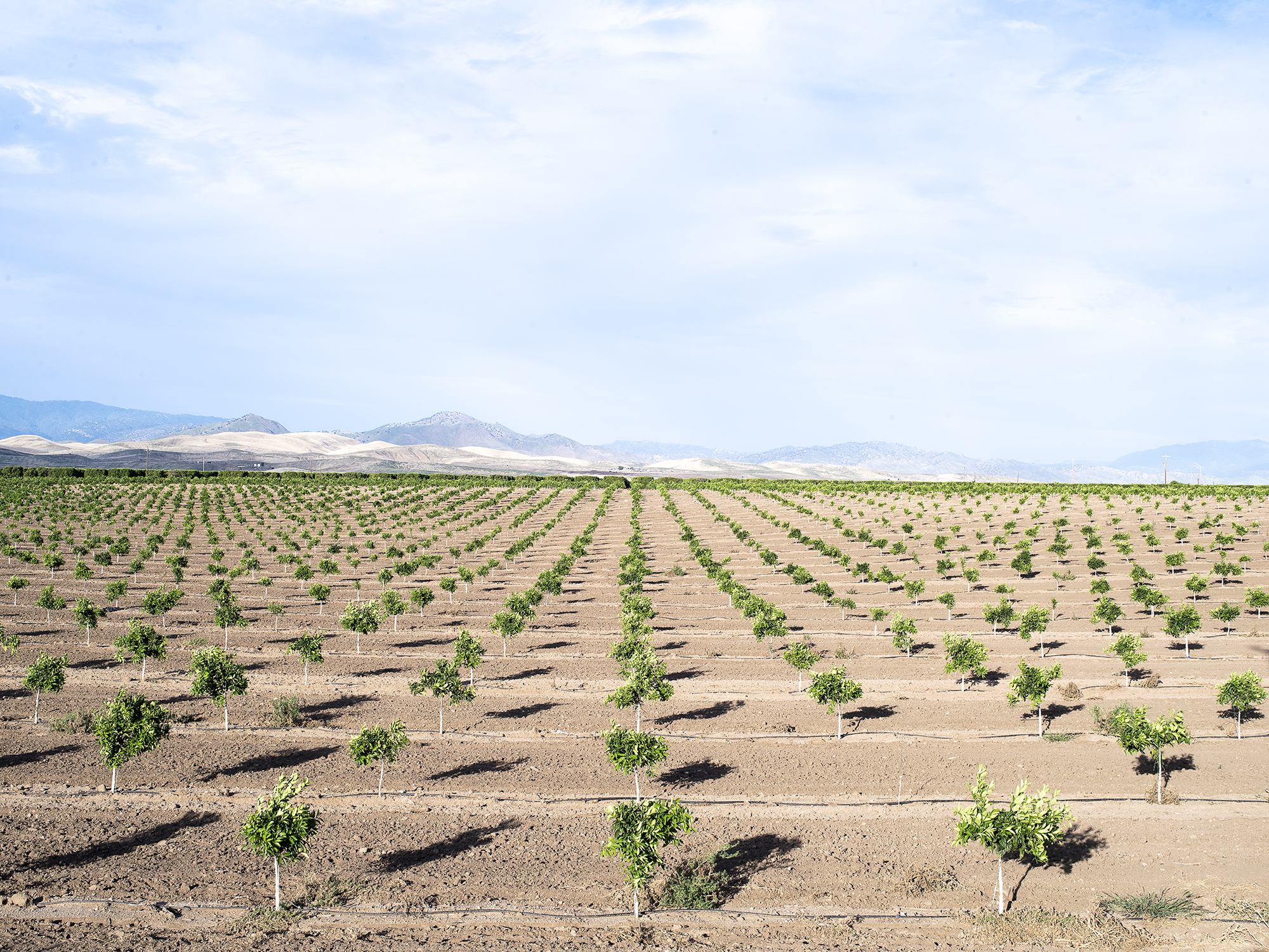 Młode drzewa pomarańczowe i ich nawadnianie, White Wolf Road, Bakersfield, (2019)