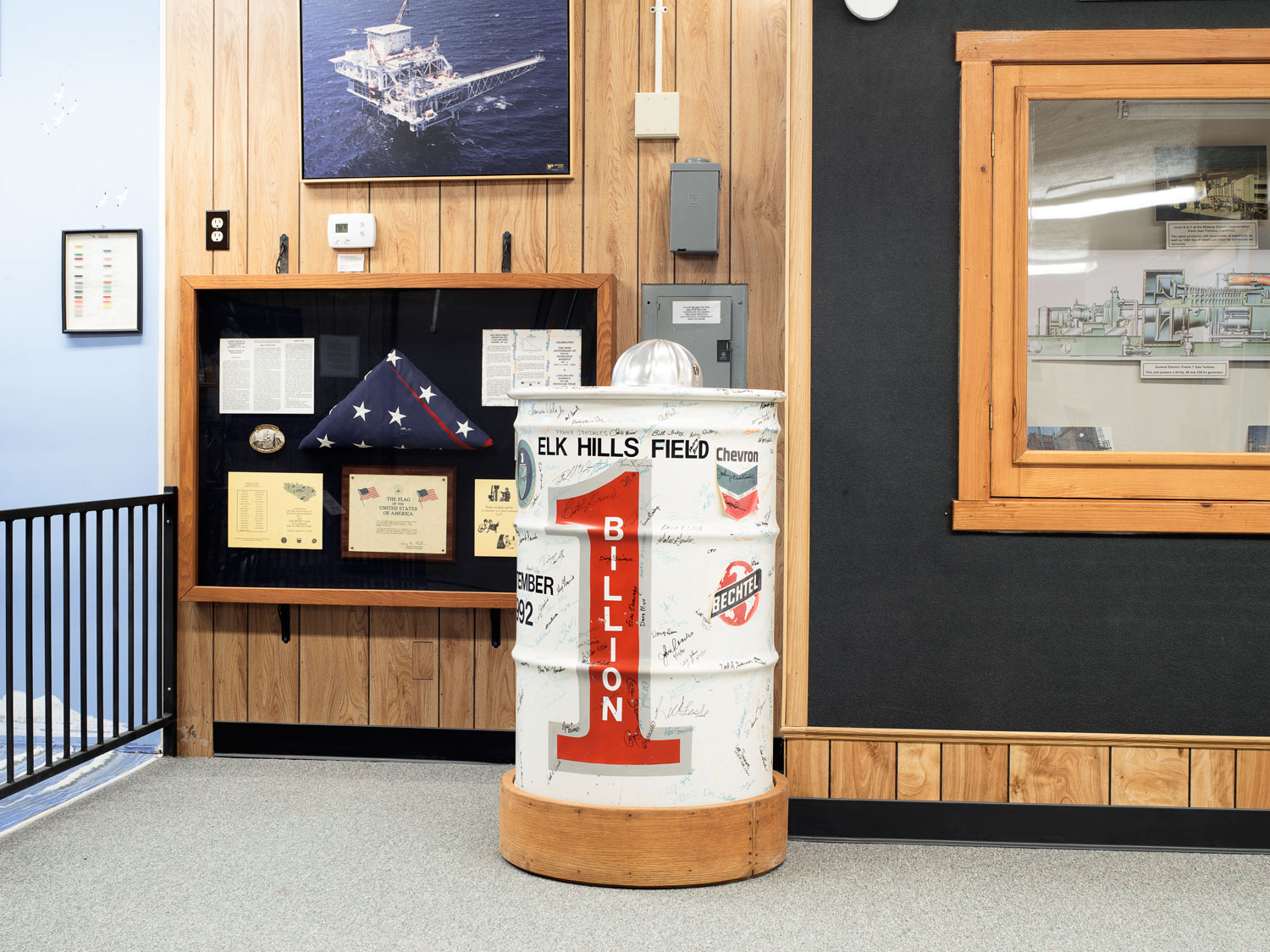 Oil barrel commemorating the billion barrel of oil extracted from the Elk Hills Oil Field, West Kern Oil Museum, Taft, California, USA,(2019)