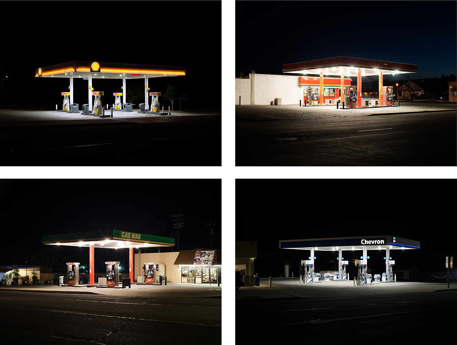 I. Shell, 615 Poso St, Maricopa, California, USA, (2019) II. Fast Strip, 296 East Elm Ave, Coalinga, California, USA, (2019) III. Gas War, 830 Center St, Taft, California, USA, (2019) IV. Chevron, 100 Kern St, Taft, California, USA, (2019)