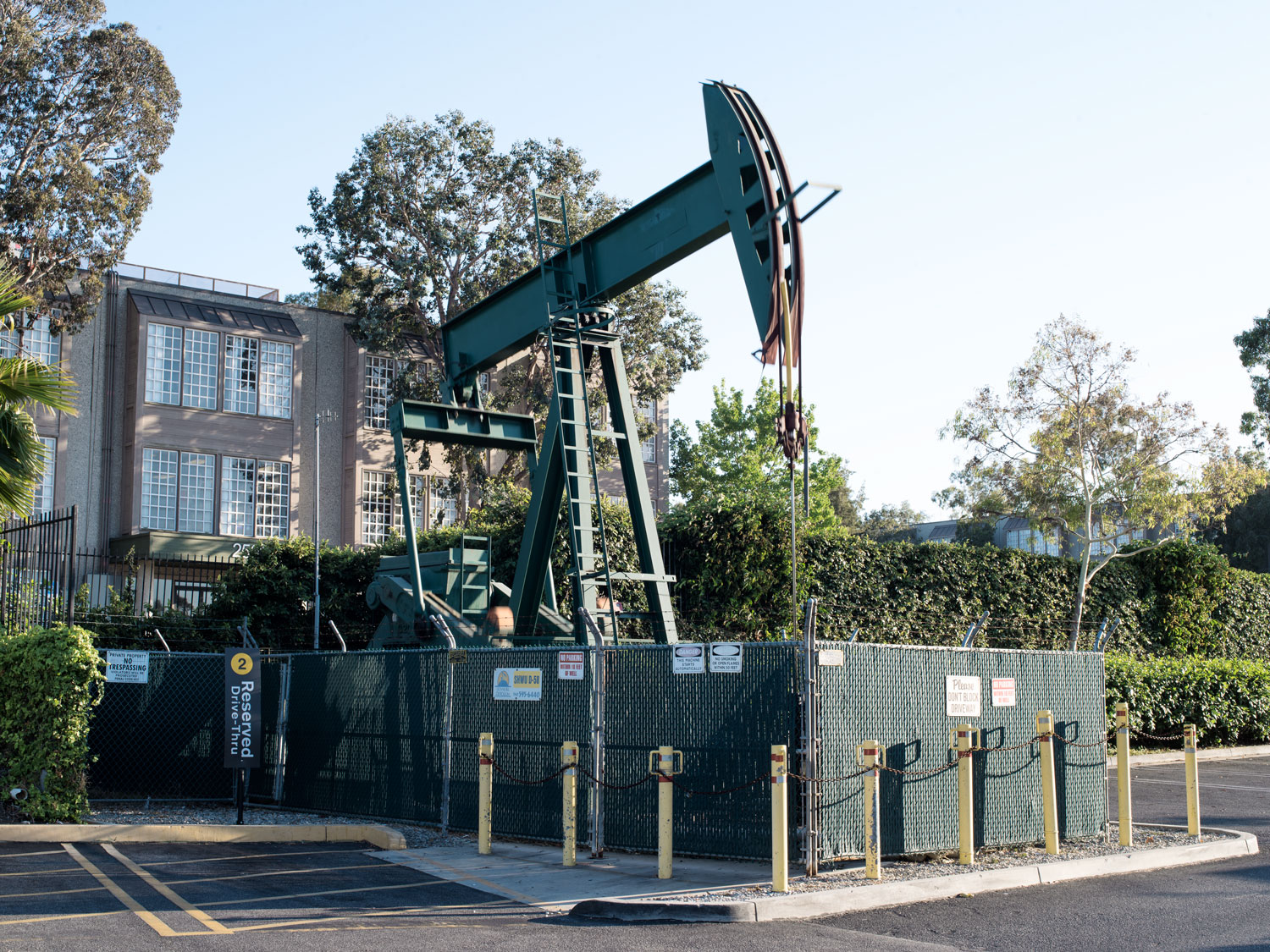 One of the Signal Hill Oil Field's pump jacks in a McDonald’s car park, Cherry Avenue, Signal Hill, Los Angeles, California, USA, (2019)