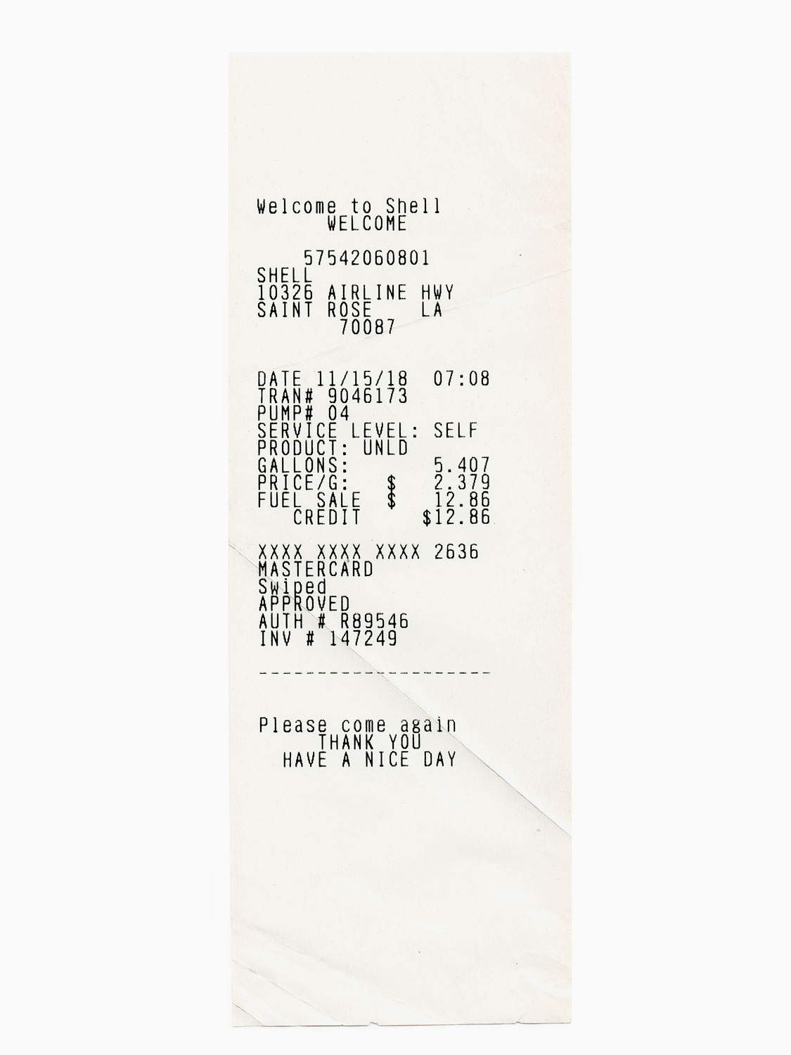Shell gas receipt, 10326, Airline Highway, Saint Rose, Louisiana, USA, (2019)