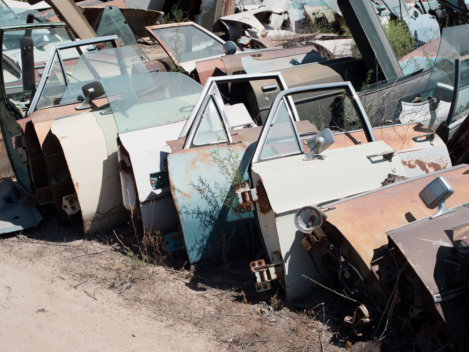 Salvaged car doors, Turners Auto Wreckers, 4248 S Willow Ave, Fresno, California, USA, (2019)