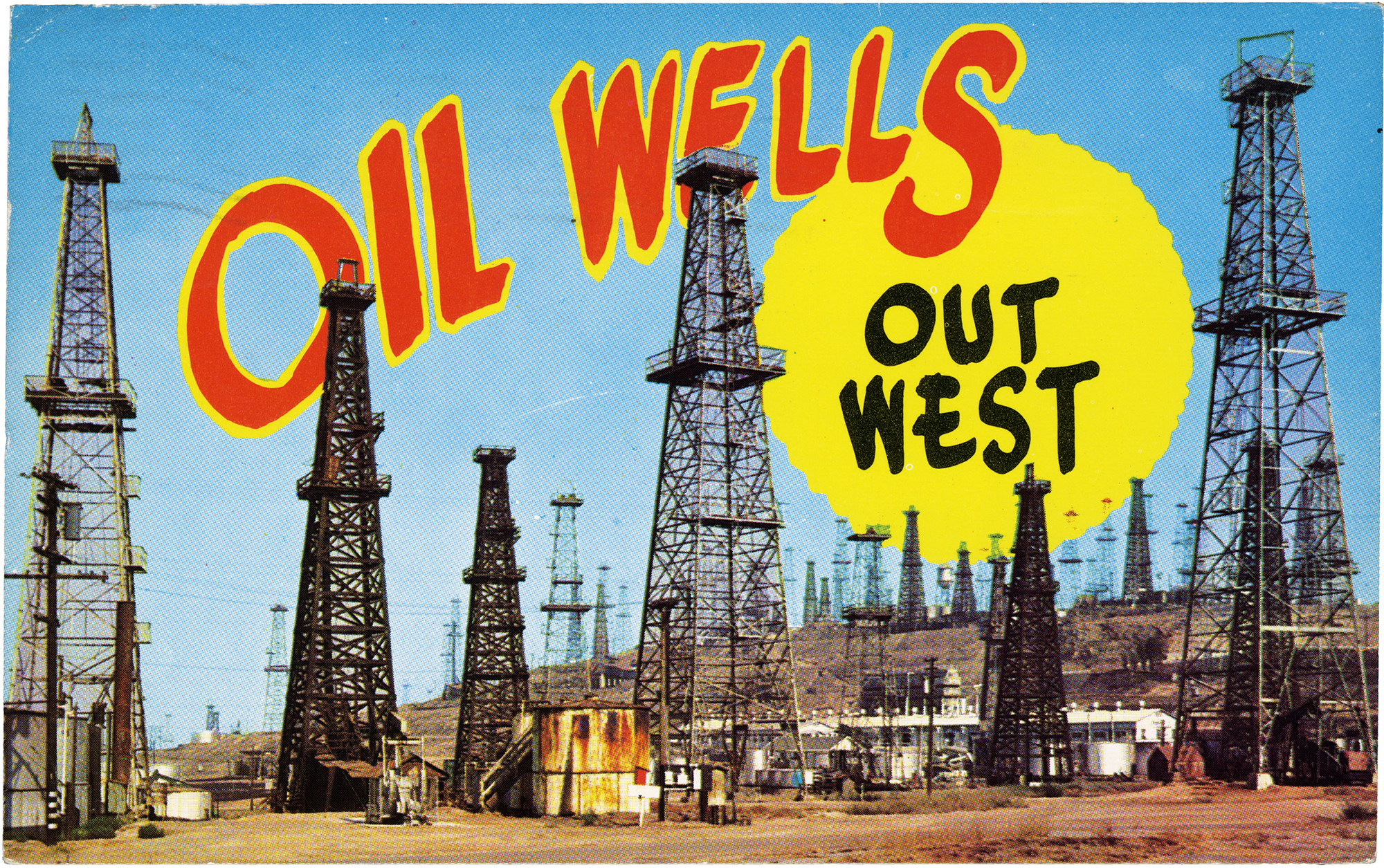 Post card showing beach front oil derricks, Huntington Beach Pier, Los Angeles, California, USA, (1953)