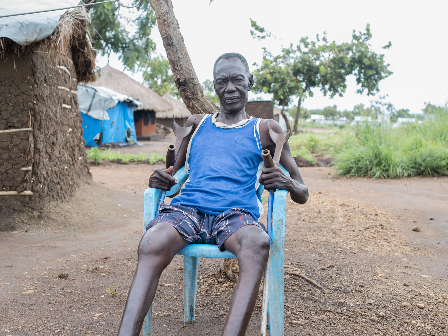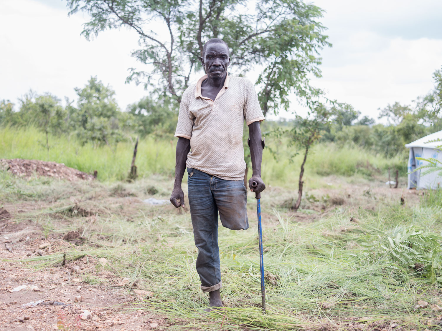 For new arrivals like ______, the support of the newly establish community was invaluable. Having lost his leg when he was shot by government forces who were raiding his village for food supplies, ______ relies on neighbours to fetch water because he cannot maintain his balance when carrying a full jerry can. However, even-though ______ was unable to undertake most tasks that involve heavy lifting, he was helping his neighbour, who had recently undergone surgery for and appendicitis, to clear the grass on her plot.