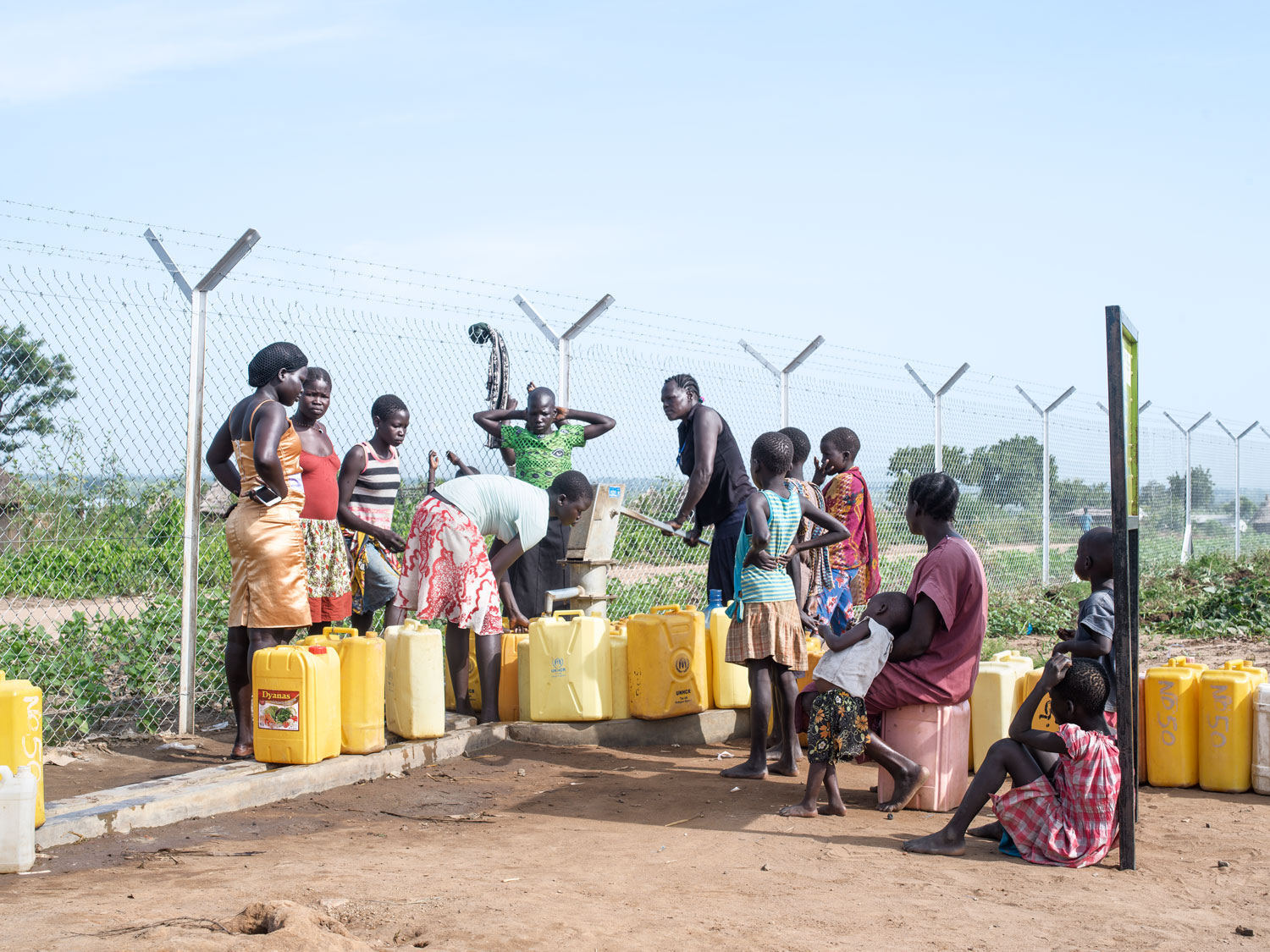 For safe drinking water, refugees must fill their jerry cans up at a water point and then carry the water back to their plots. The water points, which can be tanks, solar-powered ground water pumps or hand pumped bore holes, are always in demand leading to long queues of jerry cans waiting to be filled up.