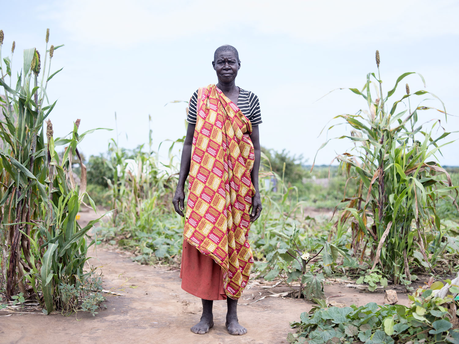 _____ and her sorghum crop, Pagarinya refugee settlement, Amuru District (2017)